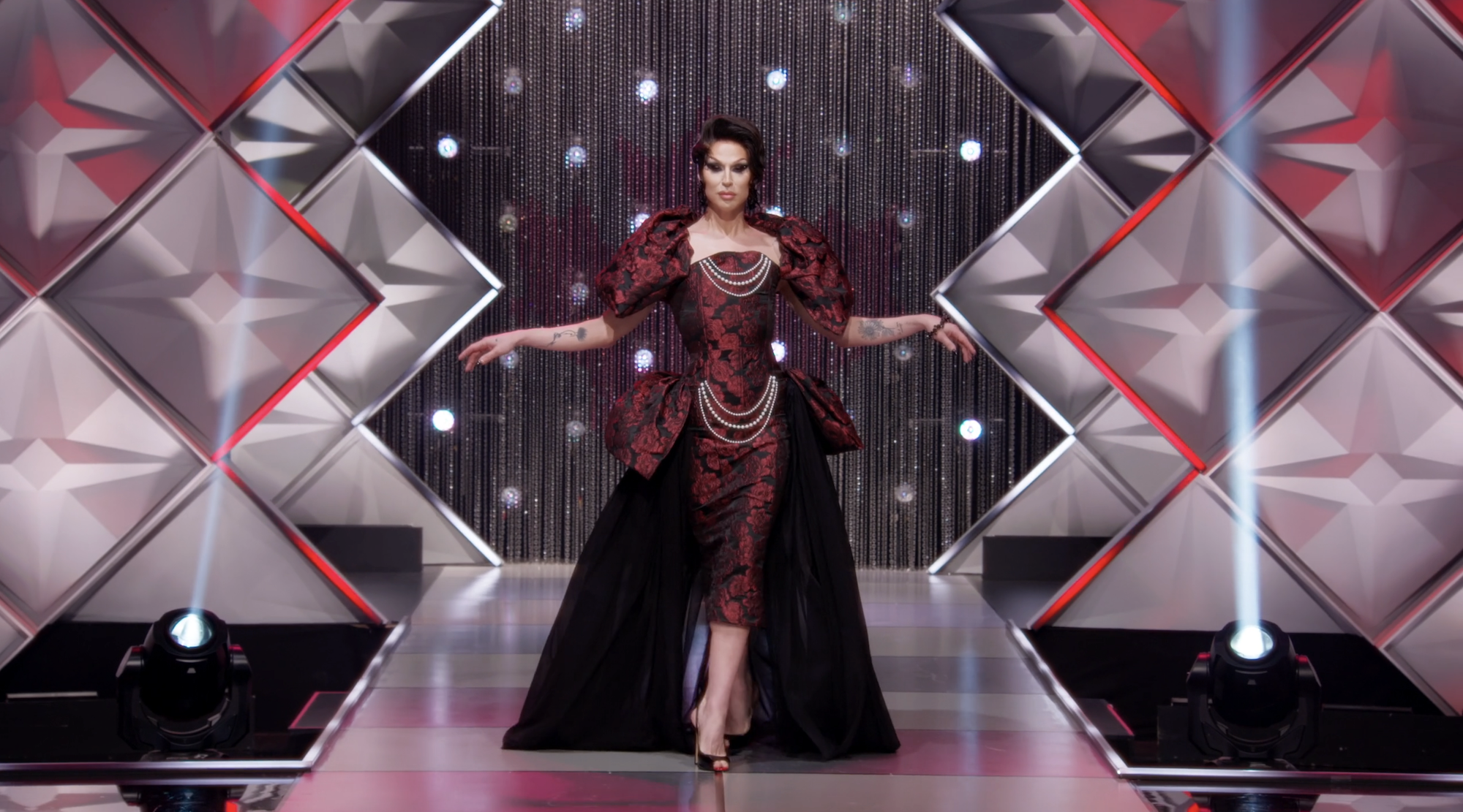 Then we’re onto Brooke Lynn’s runway presentations, and there are a clear top and bottom three in the crop. Sami goes first in a vampy animal print look in red and black. There’s a fit issue in the bust, but overall? This is pretty good! It feels distinctly Sami, but also like a good fit for Brooke Lynn. (The fact that she’s wearing a black wig and dark makeup this week, when all the queens primarily used dark tones for their looks, is a true blessing.) Van comes next, and she is simply on another level. Her garment looks like something Brooke Lynn would wear to host an episode of this show. It is jaw-dropping. You will not be surprised to hear Van wins this challenge, and it’s really not close, but there’s at least one more look that stands up to it.